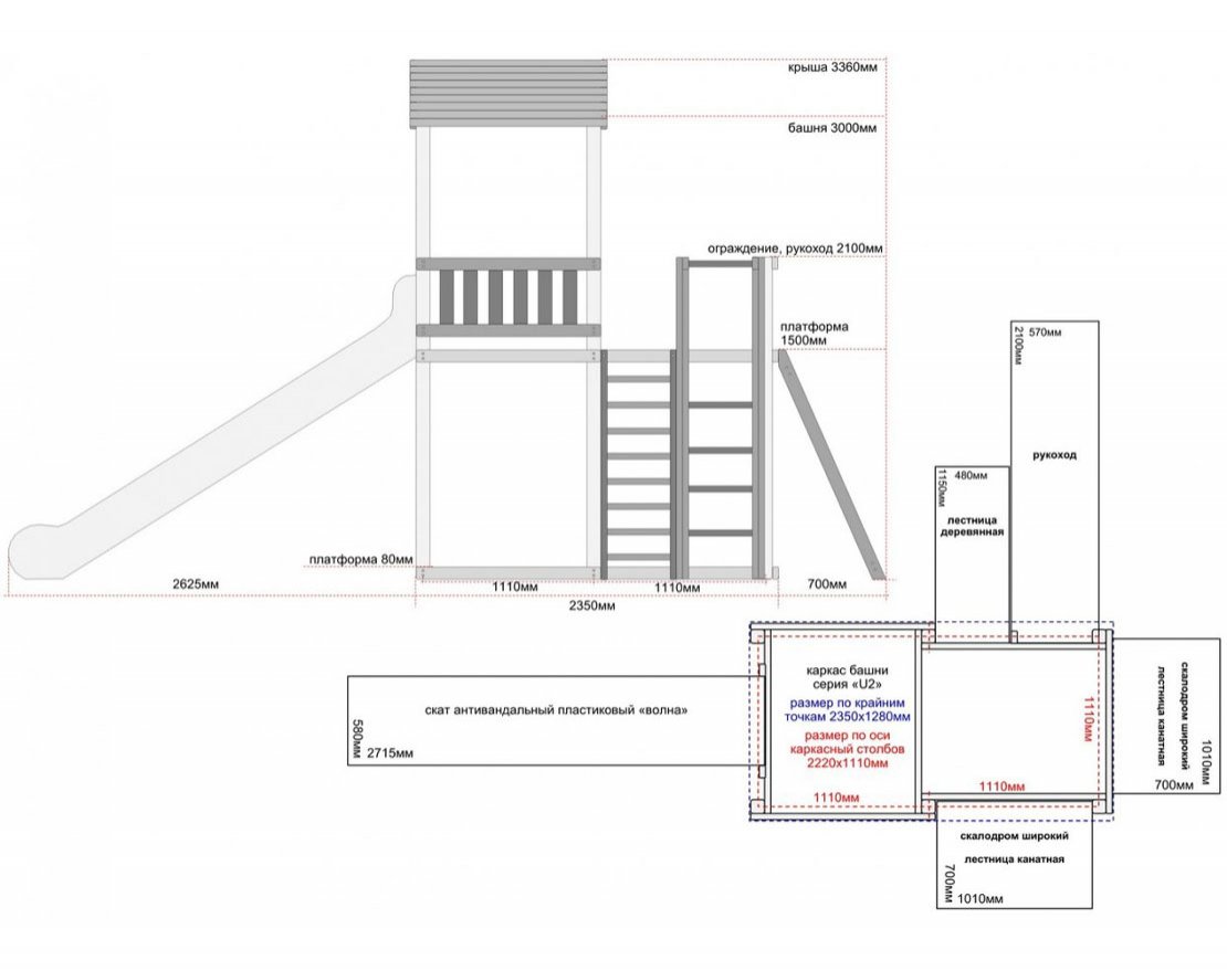 Рекомендованная распределенная единовременная нагрузка: игровая платформа 350кг., деревянная лестница 100кг., скалодром 150кг., канатная лестница 150кг., рукоход 150кг, скат 150кг.