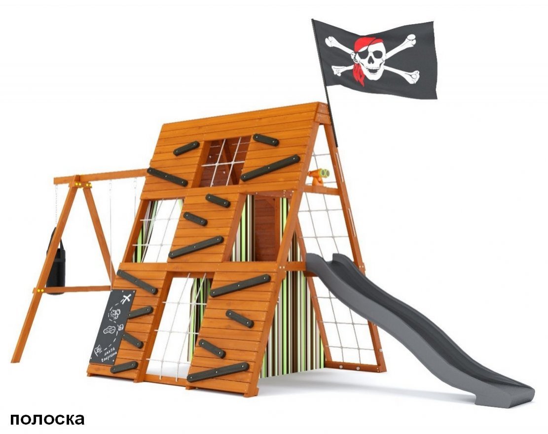 - Занавесы с подхватами способствуют созданию мелодраматических сцен, а наличие меловой доски размером 810х390 мм позволит детям рассказывать свои истории и рисовать картинки. Внутренняя лестница и большой пиратский флаг с флагштоком создадут атмосферу пиратства и игр в прятки.