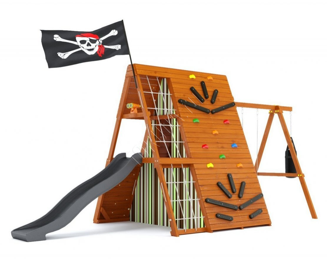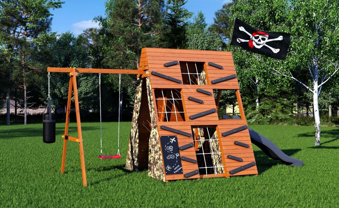 - Многосекционный скалодром, дизайнерский скалодром и разновозрастная гладиаторская сетка дадут детям возможность попрактиковаться в лазании и укрепить свои мышцы. Боксерская груша в свою очередь поможет детям убрать энергию. В игровом комплексе также есть горка высотой 2,2 метра с платформой для спуска, качельный блок с качелями лодочка и внутренний лаз с выходом на платформу.