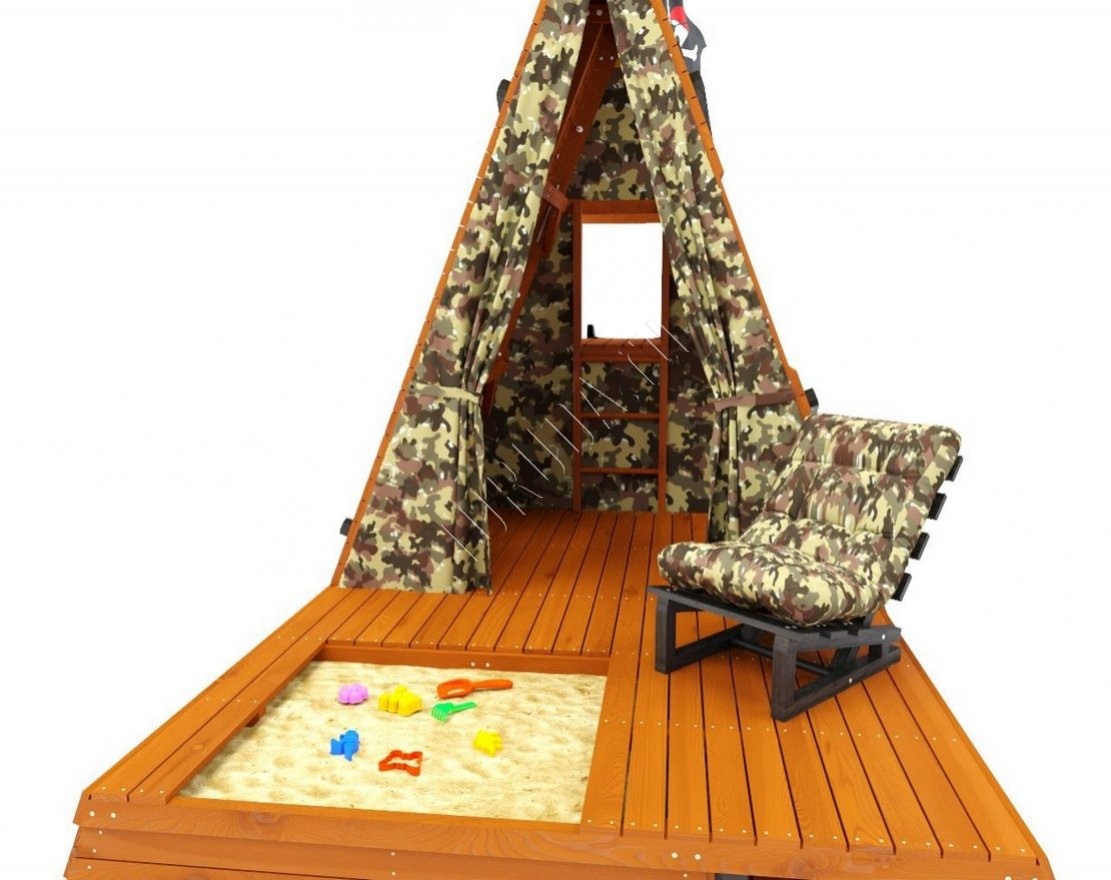 Спортивный домик – идеальное решение для тех, кто хочет обеспечить своих детей разнообразными занятиями и играми на своем дачном участке или в коттедже. Конструкция домика выполнена в виде игрового пространства со встроенной песочницей, зоной хранения игрушек и подиумом-сценой, которая может служить всемирной студией для проведения спектаклей.