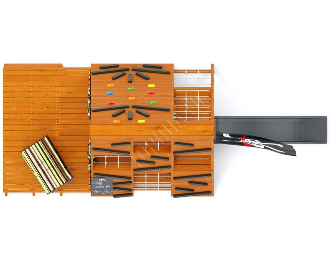 - Дизайнерский скалодром с пластиковыми и деревянными зацепами, многосекционный скалодром с сеткой и зацепапами, разноуровневые гладиаторские сетки и сетка-лазалка, бинокль и меловая доска – всё это позволит детям в полной мере ощутить радость движения и активной игры.