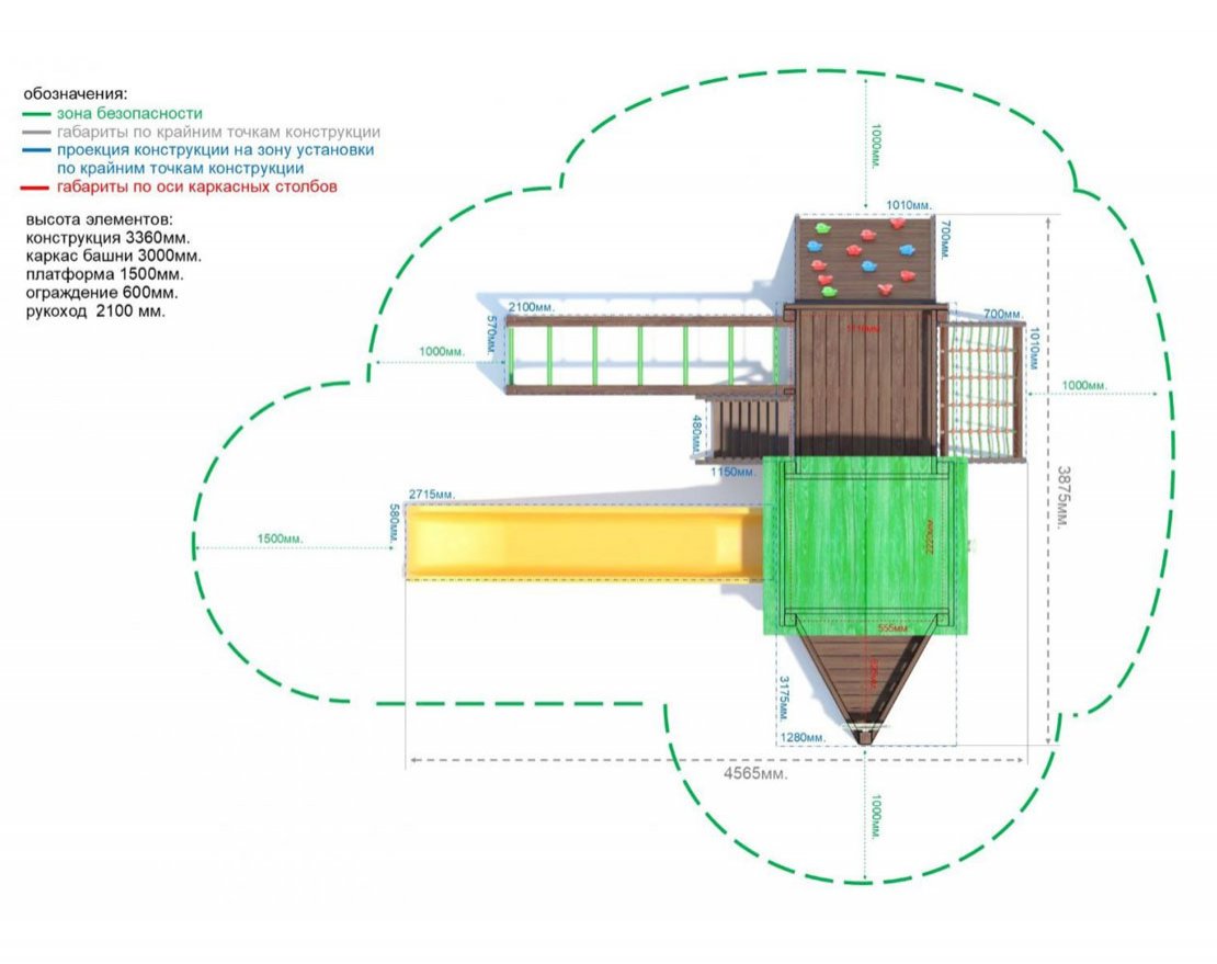 Для безопасной эксплуатации конструкции, площадка должна быть свободна от зеленых насаждений, сооружений и других конструкций, ровная, без перепадов уровня, без впадин и насыпей. Габариты площадки с учетом зоны безопасности длина 7065мм. ширина 5875мм., площадь площадки S-41,5м². Запрещено устанавливать конструкцию в зонах с повышенным риском провалов в грунте (болотистая местность, береговая линия водоемов, в непосредственной близости с оврагами и обрывами).
