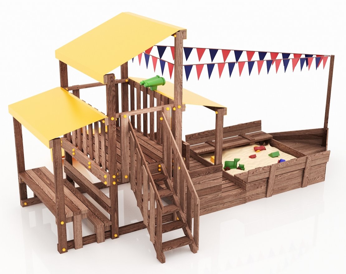 Детская песочница с крышкой-лавочкой и кораблик, включающий в себя штурманскую рубку и капитанский мостик с горкой с высоты 900 мм с флажками.