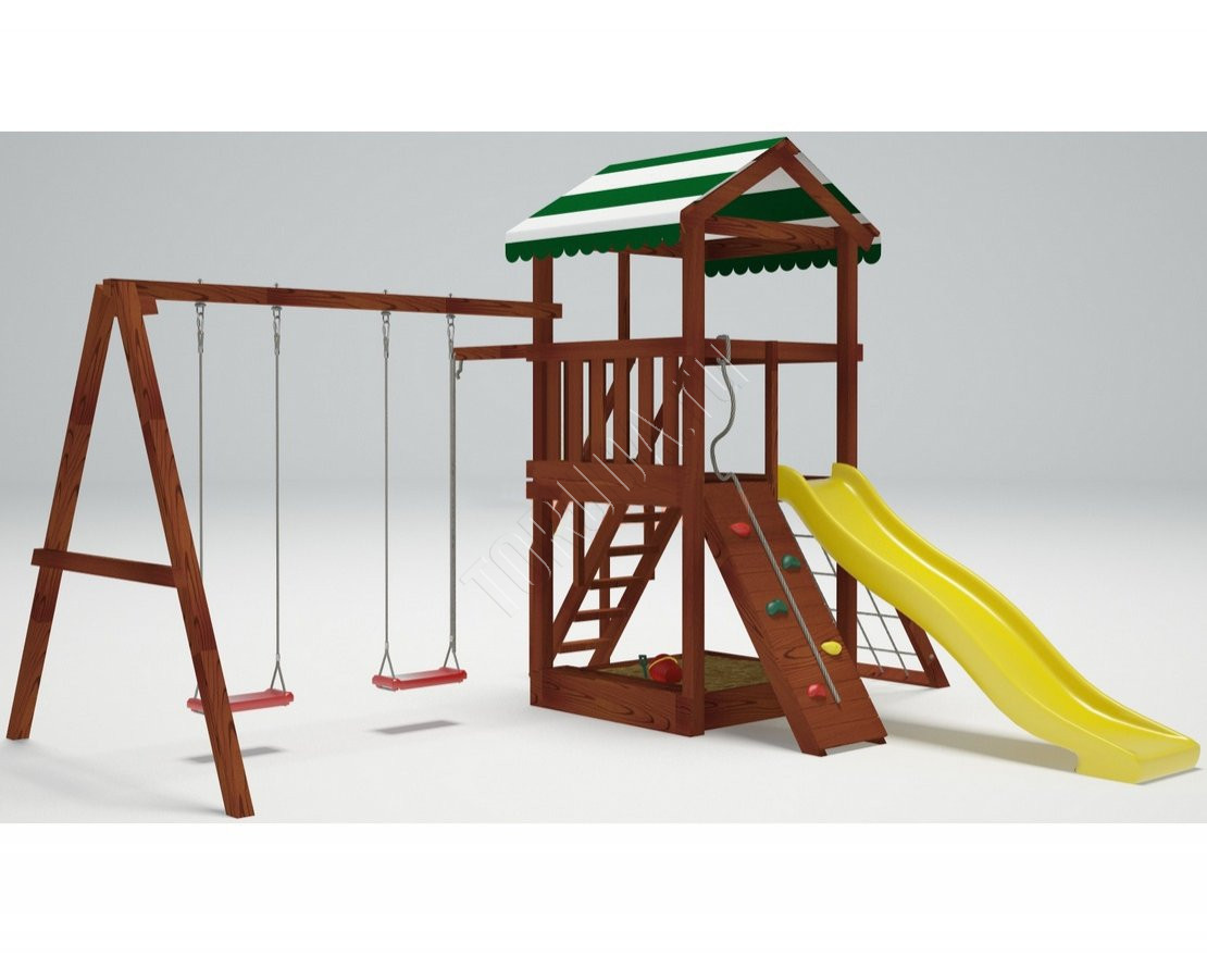- Безопасность и надёжность: конструкция выполнена из качественных натуральных материалов, устойчивых к погодным условиям. Болтовые соединения закрыты защитными заглушками, а все элементы комплекса проходят строгий контроль качества.