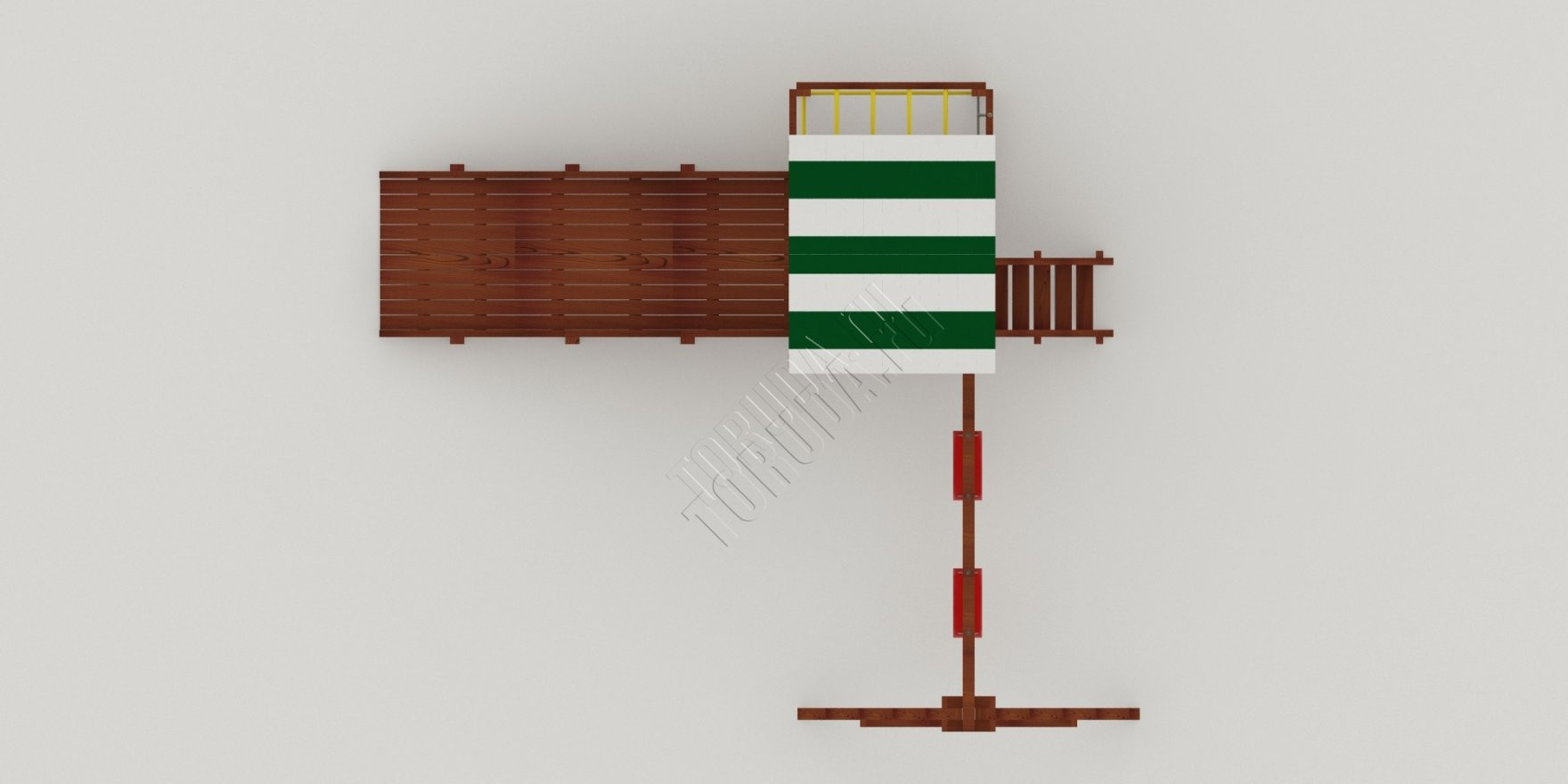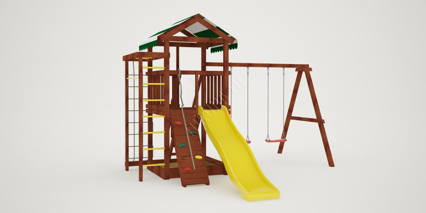 Конструкция, качество дерева и качельные подвесы соответствуют ГОСТ. Основной материал натуральный – это экологичный клееный брус, он гладкий на ощупь, его углы скруглены во избежание получения ссадин. Площадка полностью безопасна: все крепежи и болты плотно закрыты заглушками, а спортивное оборудование используется от проверенного сертифицированного бельгийского производителя.
