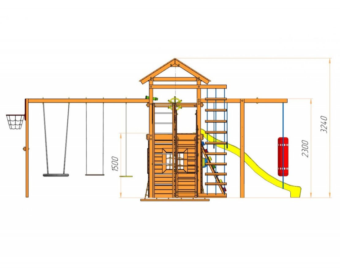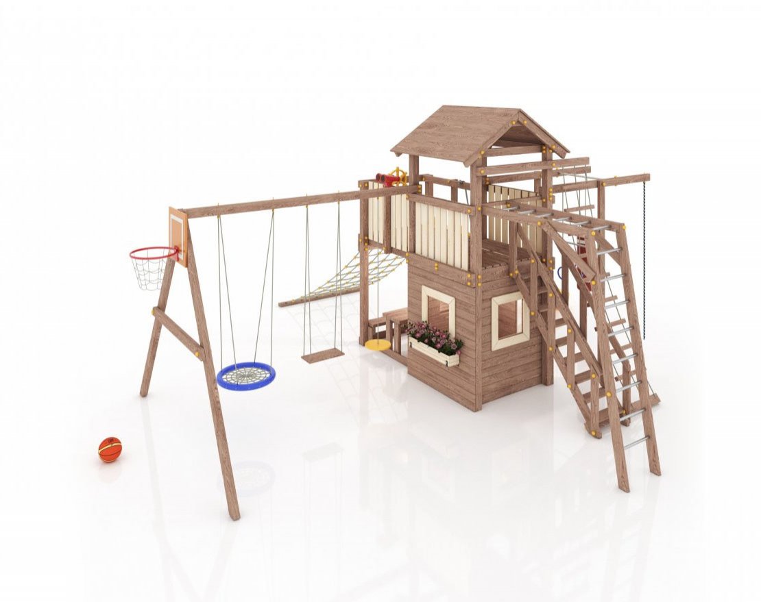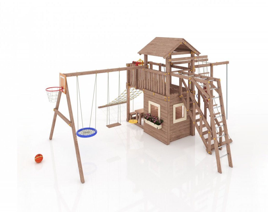 Максимально возможная комплектация в сочетании с турником, скамейками со столиком, домиком с окошками (теремок), в комплекте большая паутинка и пиратская лестница. Детская площадка в полной комплектации позволит вашим детям разнообразить свои игры на свежем воздухе, а так же пригласить своих друзей для веселого времяпрепровождения. Места хватит всем!