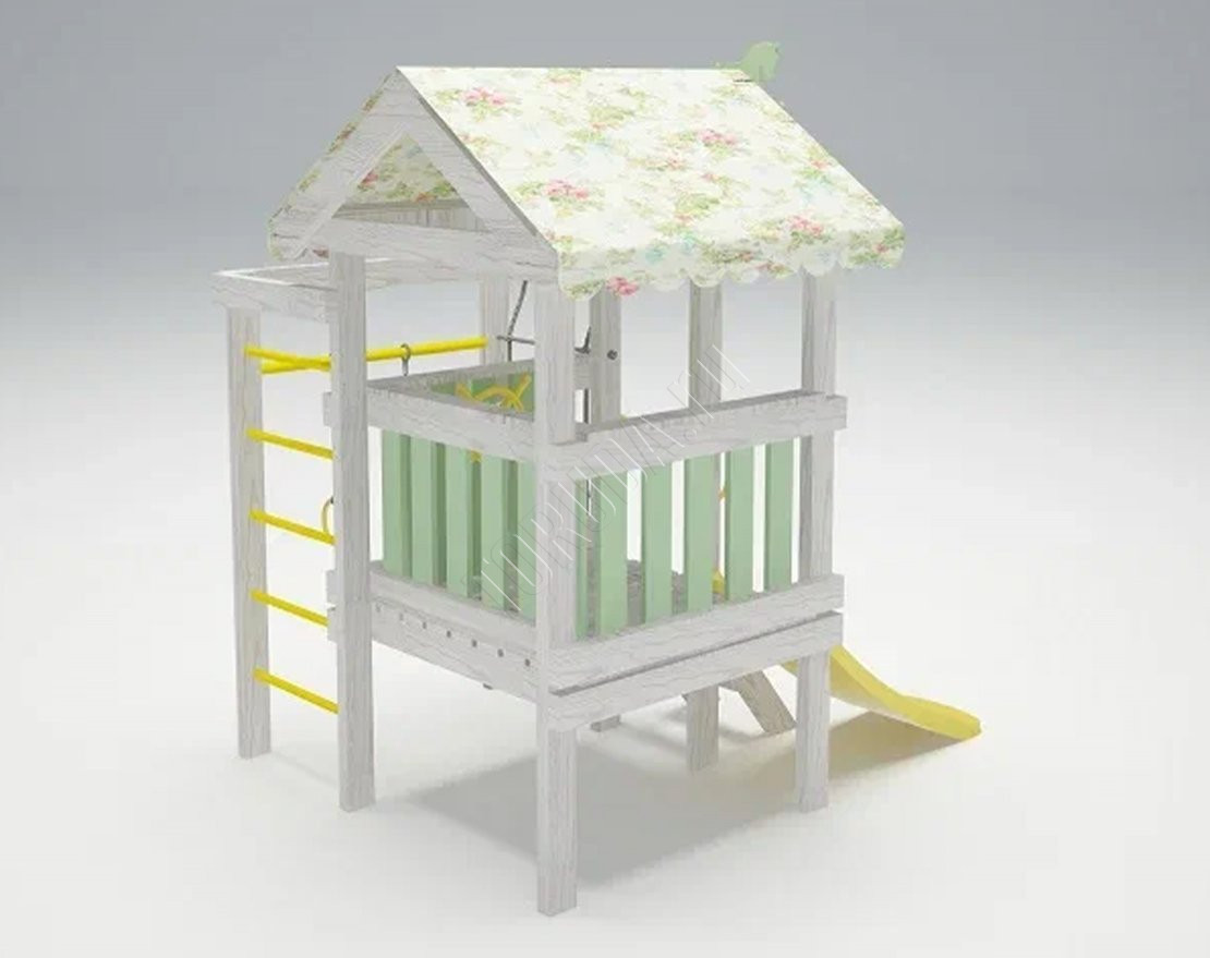 Эта универсальная спортивно-игровая площадка не занимает много места. Домик стоит на платформе в 60 см от уровня пола. Под ней можно расположить боксы с детскими игрушками или небольшими вещами. Подняться можно с помощью удобной широкой лестницы, каркас которой сделан из дерева.