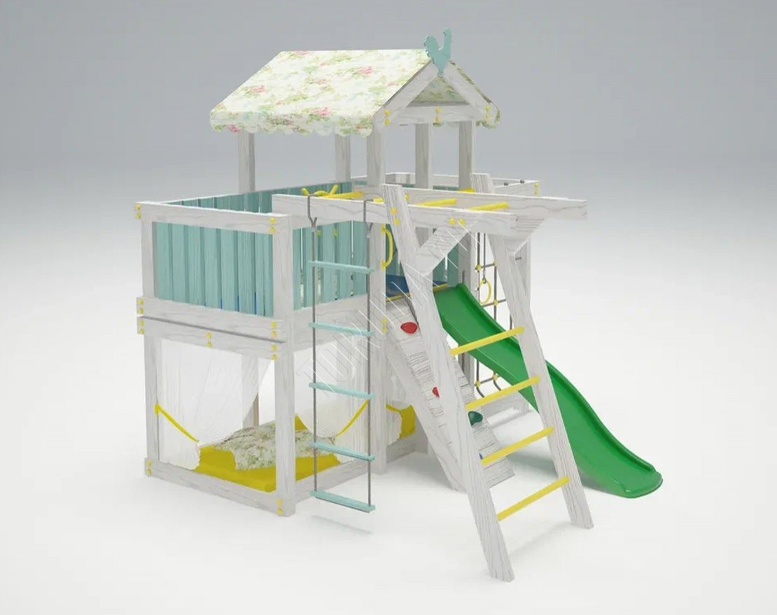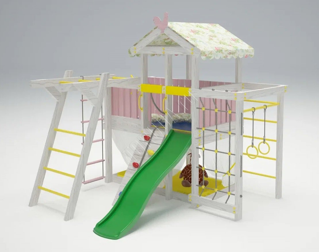 Двухъярусная площадка – разработана специально для большой семьи. Прочный каркас из массива хвойных пород выдержит нескольких детей.