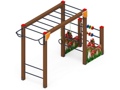 Рукоход выполнен из труб, 27 мм, размером 580 мм, шаг перекладин 300мм окрашенных порошковой краской в цвет графитсерый, и бруса не более 100х100мм и длиной 2000мм. На рукоходе закреплены гимнастические кольца на полимерных канатах.